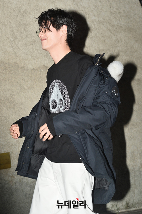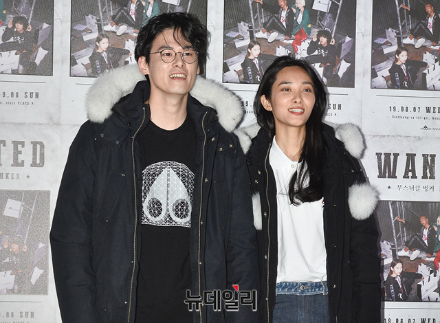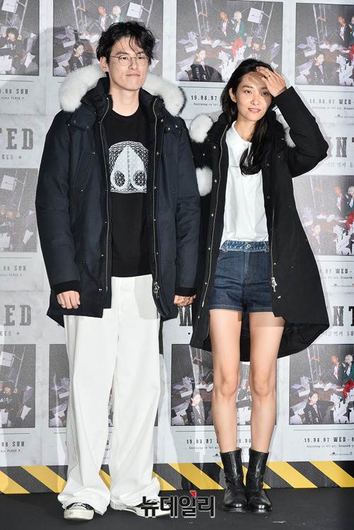 모델 김원중(왼쪽), 곽지영이 7일 오후 서울 강남구 신사 PLACE P에서 열린 '무스너클(MOOSE KNUCKLES)' 팝업스토어 오픈 기념 행사에 참석해 포토타임을 갖고 있다.