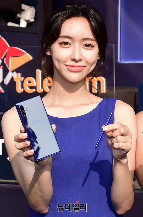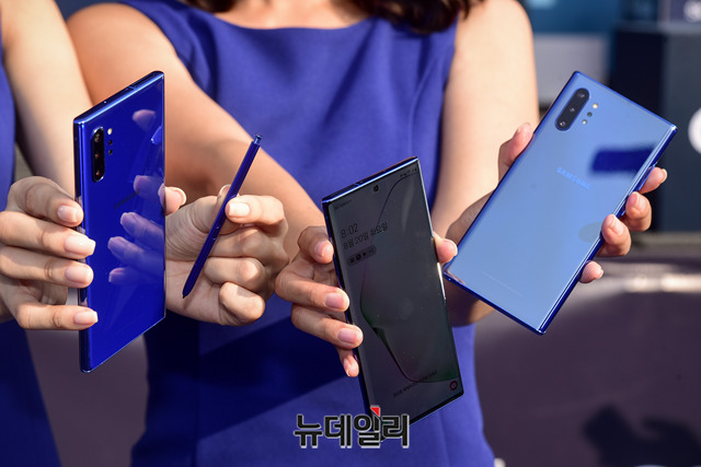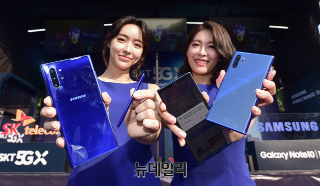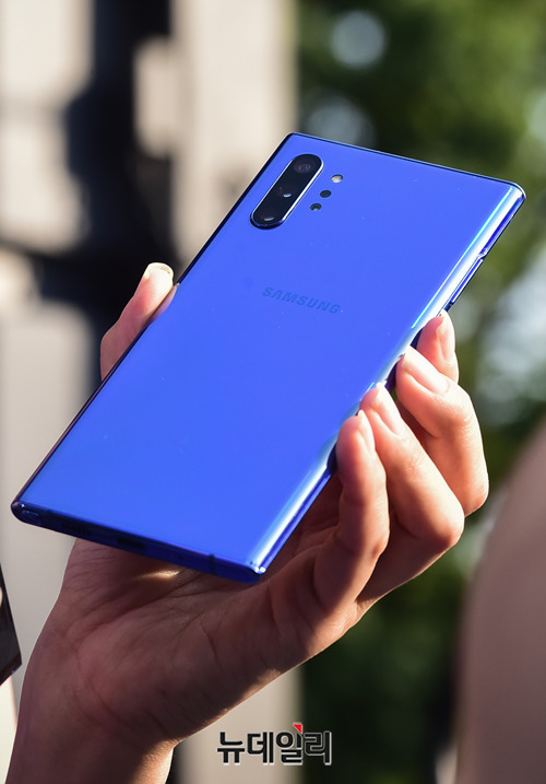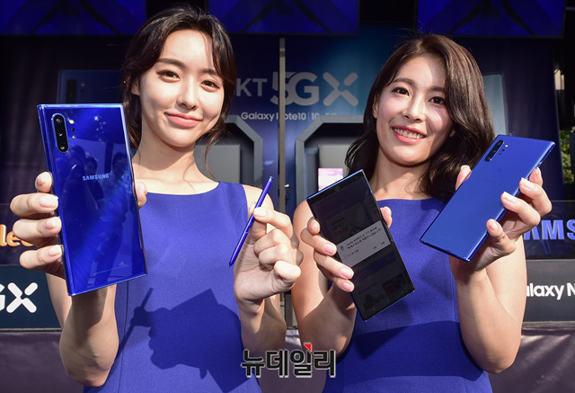SK텔레콤이 20일 오전 서울 송파구 올림픽공원에서 열린 갤럭시노트 10 시리즈 출시 기념행사에서 새롭게 출시한 갤럭시노트10 시리즈 '아우라블루' 색상을 선보이고 있다. 갤럭시노트 시리즈 '아우라블루' 색상은 SK텔레콤에서만 만나볼 수 있다.'갤럭시노트10'시리즈는 S펜의 움직임을 인식해 스마트폰을 원격으로 제어할 수 있는 스마트 'S펜', 한 손에 쏙 들어오는 얇고 가벼운 디자인, 초고속 5G, 12GB RAM 등 PC급 고성능을 갖춘 것이 특징이다.