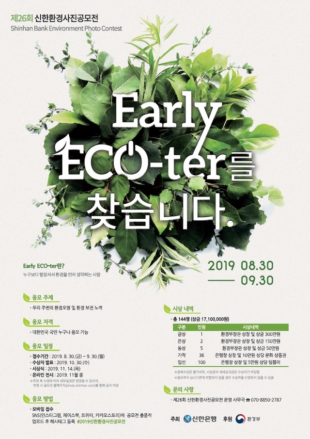 신한은행이 제26회 ‘신한 환경사진 공모전’을 개최하고 30일부터 SNS를 통해 작품 접수를 시작한다.신한 환경사진 공모전은 환경 보존의 중요성을 알리기 위해 신한은행이 1994년부터 매년 개최하고 있는 사회공헌 사업으로 환경부가 후원하고 있다.이번 공모전은 ‘누구보다 앞장서서 환경을 먼저 생각하는 사람이 되자’는 의미를 담아 ‘Early ECO-ter를 찾습니다’라는 주제로 진행되며 공감대 확산을 위해 많은 사람들이 쉽게 참여할 수 있도록 SNS 응모 방식을 도입했다.