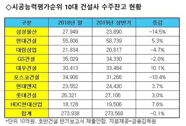 3일 금융감독원 전자공시시스템의 반기보고서에 따르면 시공능력평가순위 10대 건설사(삼성·현대·대림·GS·대우·포스코·현대엔지·롯데·HDC현대산업개발)의 수주잔고 합계는 올 상반기 273조5680억원으로, 지난해 말(273조938억원)보다 0.1%(3700억원) 가량 줄었다. 올해 처음으로 10대 건설사에 이름을 올린 호반건설은 비상장사로 반기보고서를 제출하지 않았다.