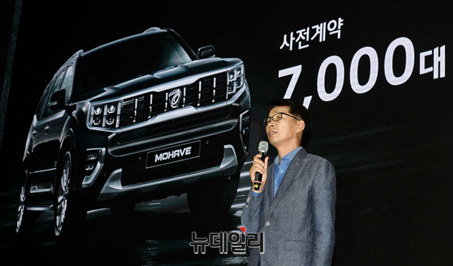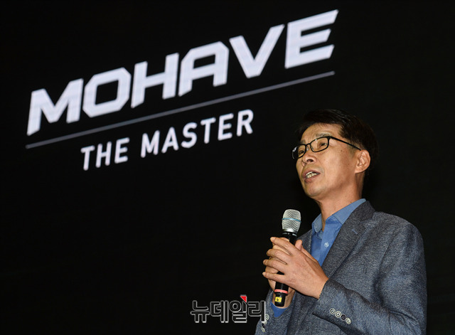 권혁호 기아차 국내사업본부 부사장이 5일 인천 중구 네스트호텔에서 '모하비 더 마스터(MOHAVE the Master)'를 소개하고 있다.'모하비 더 마스터'는 프레임 바디를 기반으로한 V6 3.0 디젤엔진을 장착한 대형 SUV. 최고출력 260PS, 최대토크 57.1kgf·m의 강력한 동력성능을 갖췄다. 후륜 서스펜션 구조 개선 등으로 안정 및 편의사양을 탑재했다.복합연비는 9.4km/L, 가격은 플래티넘 트림이 4,700만원, 마스터즈 트림은 5,160만원부터다. (인천 중구=박성원 기자)