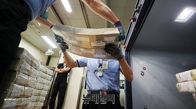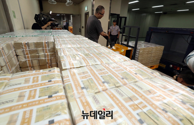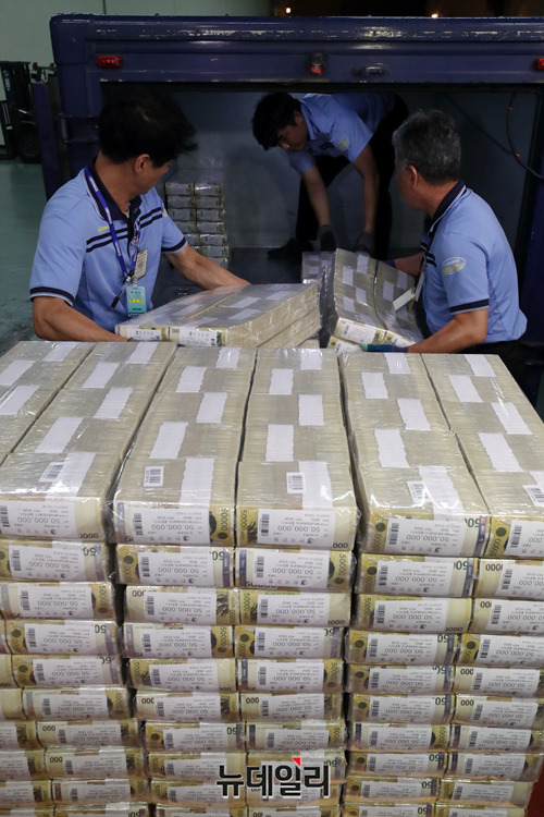 추석 명절을 앞둔 10일 오후 서울 한국은행 강남본부에서 현금운송 관계자들이 시중은행에 공급될 추석자금 방출작업을 하고 있다.
