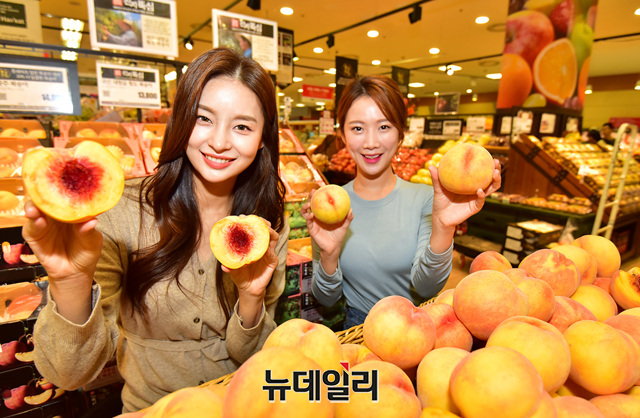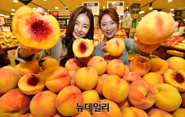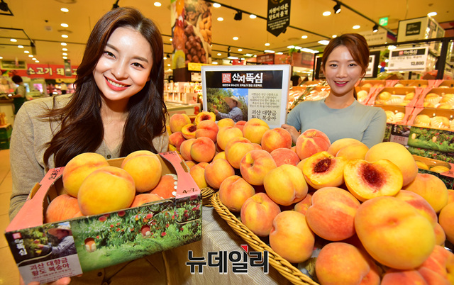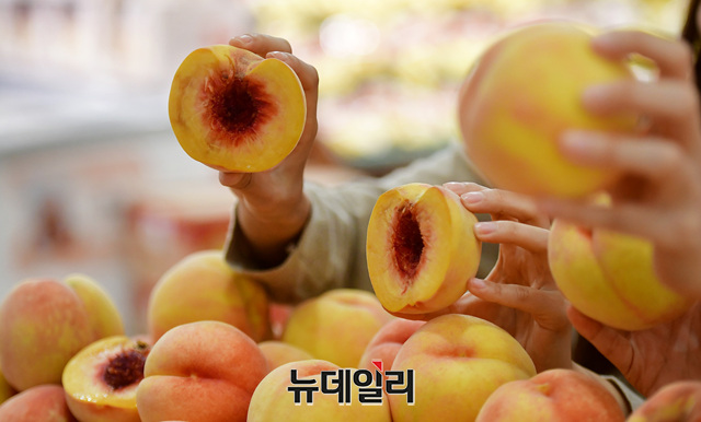 롯데마트가 23일 오전 서울 중구 서울역점에서 권순수(충북 괴산군) 농부의 농가를 비롯한 36개 복숭아 농가에서 수확한 '산지뚝심 대향금 황도 복숭아'를 선보이고 있다.이번에 선보이는 '대향금' 품종은 황도 복숭아 계열로, 둥그스름한 형태에 노란색과 붉은색이 섞여있는 색을 띈다. 단단한 식감과 향과 맛이 우수한 것이 특징이다. 복숭아를 담은 박스에는 농부의 얼굴을 담았다. 10월 8일까지 롯데마트 전 점포에서 만날 수 있다.롯데마트 '산지뚝심' 프로젝트는 8월부터 우수 로컬 상품 생산자를 발굴·육성하고 협업하는 프로그램. 이번에 선보이는 '산지뚝심 대향금 황도 복숭아'는 충북 괴산군의 우수한 농가들을 엄선해 선보이는 상품이다.