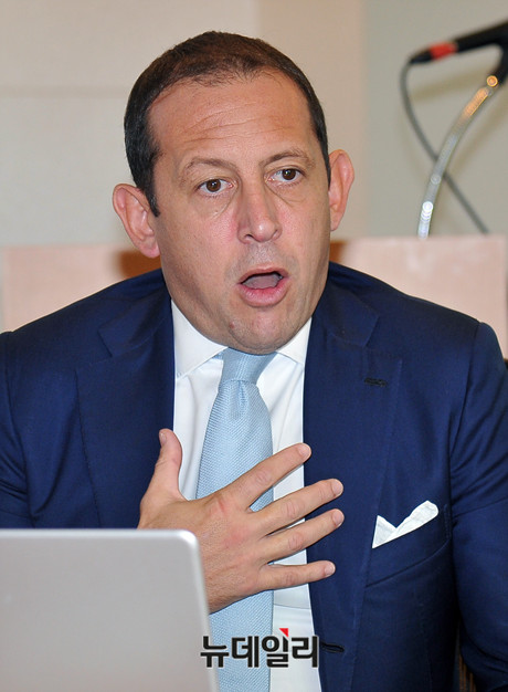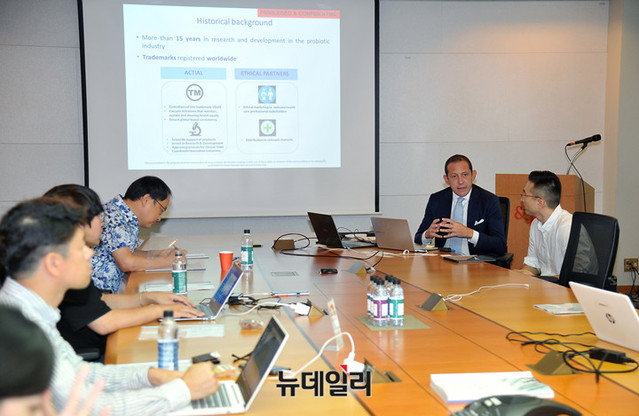 프란시스코 백스(Francesco Bax) 악티알 파마수티카 글로벌 전략 디렉터가 26일 오후 서울 중구 한진빌딩에서 열린 서윤패밀리가 주최한 'VSL#3' 관련 글로벌 소송 설명회에 참석해 법적 분쟁 현황에 대해 설명하고 있다. 악티알 파마수티카는 VSL#3를 제조하는 이탈리아 기업이다.앞서 VSL#3의 국내 판권을 소유해 유통·판매 중인 서윤패밀리와 VSL#3의 브랜드명을 '드시모네'로 바꿔 출시한 바이오일레븐이 오리지널 원료인 프로바이오틱스 균주의 소유권을 두고 신경전을 벌인 바 있다.