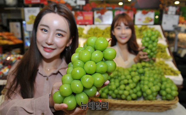 • 롯데마트가 16일 오전 서울 중구 롯데마트 본점에서 영천 '샤인머스켓'을 선보이고 있다. 경북 영천은 샤인머스켓의 주요 산지다. 이 지역은 강우량이 적고 일조량이 풍부하며, 밤낮 일교차가 커 과실이 당도가 높고 향이 좋은 것이 특징이다.