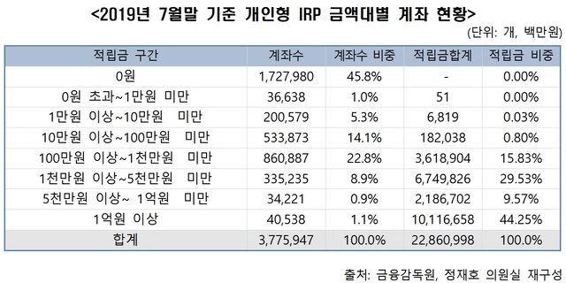 IRP 깡통계좌는 2017년 8월말 기준 154만884개, 2018년 165만6688개, 2019년 7월말 기준 172만7980개로 매년 증가하고 있다.