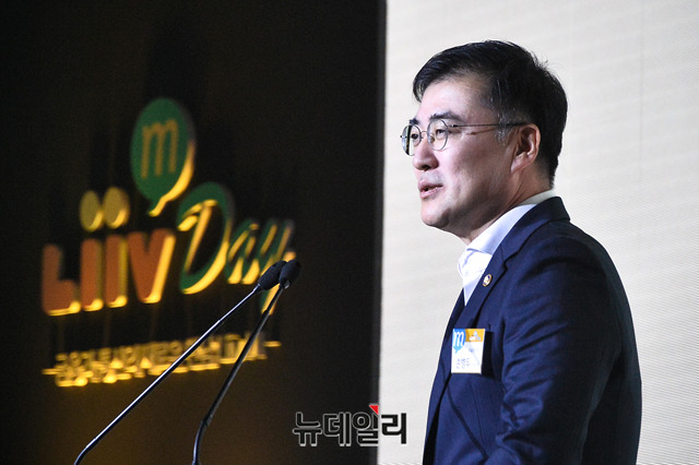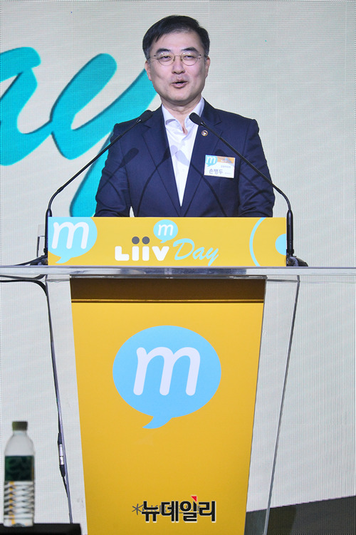 손병두 금융위원회 부위원장이 28일 오전 서울 중구 '반얀트리 클럽 앤 스타 서울'에서 열린 'Liiv M(리브 모바일)' 론칭행사에서 축사를 하고 있다.'리브 모바일'은 기존 통신사의 복잡한 요금제를 간소화하고 약정 부담 없이 자유롭게 이용할 수 있으며, 모바일로 쉽고 빠르게 가입할 수 있는 금융과 통신이 융합된 새로운 모바일 서비스다.오는 11월 4일부터는 합리적인 통신요금을 원하는 국민들에게 금융결합으로 할인된 요금제를 우선 제공하는 통신서비스를 선보이고, 12월 중순부터는 셀프 개통·USLM 인증서 등 본격적인 금융·통신 융합서비스를 단계적으로 제공한다.