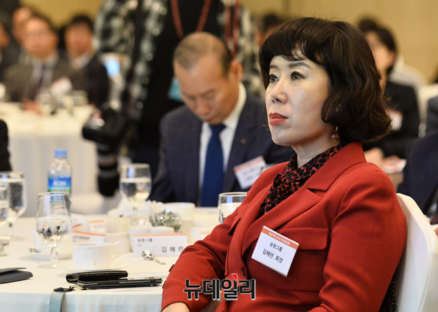 김해련 송원그룹 회장이 5일 오전 서울 서초구 쉐라톤 서울 팔래스 강남에서 열린 제178회 중견기업 CEO 조찬 강연회에서 조성욱 공정거래위원장의 '건강한 기업 생태계 조성을 위한 공정위 역할과 과제'를 주제로 한 강연을 듣고 있다.