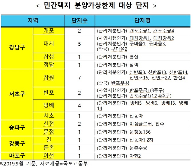 7일 국토교통부에 따르면 올해 9월 기준 강남구 개포동 개포주공1·4단지, 대치동 구마을1·2·3단지, 삼성동 홍실아파트, 서초구 반포동 반포주공1단지 등 87개 정비사업 단지가 분양가상한제 규제 대상에 올랐다.