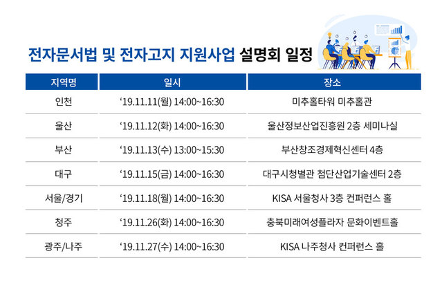 한국인터넷진흥원(KISA)은 과학기술정보통신부과 함께 전국 주요 7개 도시에서 행정·공공기관, 일반인을 대상으로 ‘전자문서 및 전자거래 기본법’에 대한 해설과 ‘대국민 고지·안내문의 전자화 시범사업’에 대한 설명회를 개최한다고 7일 밝혔다.KISA는 2017년부터 법령상 서면, 문서 등에 대한 문구를 종이문서로만 해석하는 관행 개선을 위해 전자문서법 설명회를 개최해 왔다. 올해부터는 전자문서 이용에 대한 효과 검증을 위한 전자고지 지원사업을 추진 중이다.이번 설명회는 전자문서 활용에 어려움을 느끼는 기업·일반인의 전자문서법 이해를 증진하고, 2020년 전자고지 지원사업에 대한 사전 설명을 통해 관심 있는 기업의 적극적 참여를 돕기 위해 마련됐다.설명회에서는 전자문서의 법적 효력과 활용 범위에 대한 전문가 설명과, 2020년 KISA에서 시행 예정인 전자고지 지원사업의 지원 대상, 절차 등이 제공될 예정이다. 또한 아이앤텍, 카카오페이, KT, 네이버(지정 순) 등 4개 공인전자문서중계자가 각자의 플랫폼에 대한 소개와 함께 전자고지 발송 방법·절차 등에 대해서도 안내할 예정이다.설명회는 오는 11월 11일부터 27일까지 인천, 울산, 부산, 대구, 서울, 청주, 나주 등 전국 7개 도시에서 개최된다. 자세한 일정은 KISA 대표 홈페이지 공지사항에서 확인할 수 있다.
