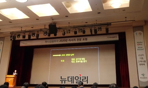 하나금융투자 이재만 투자전략팀장은 12일 여의도 하나금융투자 본사에서 열린 '2020년 리서치 전망포럼'에서 "코스피 예상 기대수익률 15%와 PBR 하단 0.85배를 적용했다"면서 내년 코스피 상단을 2450, 하단을 2000으로 전망했다.