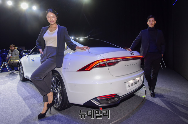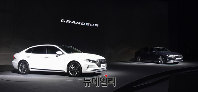 현대자동차가 19일 오전 경기 고양시 빛마루방송지원센터에서 열린 '더 뉴 그랜저' 발표회에서 신차를 선보이고 있다. '더 뉴 그랜저'는 네 가지 엔진 라인업으로 동시에 출시된다.