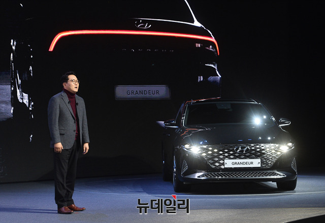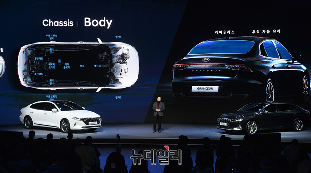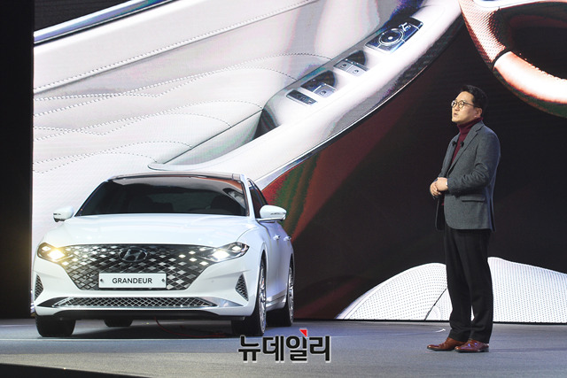 현대차 윤성훈 대형총괄 1PM 상무가 19일 오전 경기 고양시 빛마루방송지원센터에서 열린 '더 뉴 그랜저' 신차발표회에서 신차를 소개하고 있다.'더 뉴 그랜저'는 네 가지 엔진 라인업으로 동시에 출시된다. 신차 판매가격은 ▲2.5 가솔린 3,294만~4,108만원 ▲3.3 가솔린 3,578만~4,349만원 ▲2.4 하이브리드 3,669만~4,489만원(세제혜택 후) ▲일반 판매용 3.0 LPi 3,328만~3,716만원으로 확정됐다. (경기 고양=박성원 기자)