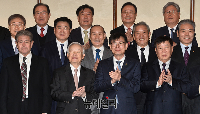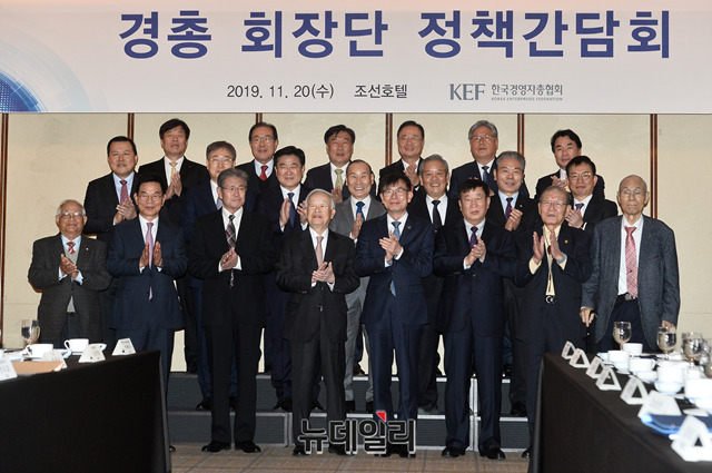 손경식 한국경영자총협회 회장, 김상조 청와대 정책실장 및 참석자들이 20일 오전 서울 중구 웨스틴조선호텔 바이올렛룸에서 열린 '경총 회장단 간담회'에서 기념촬영을 하고 있다.이날 간담회는 미·중 무역전쟁과 한·일 경제분쟁 등 대내외 악재로 신음하는 기업들의 어려운 현실의 해법을 논의하기 위해 열렸다.손 회장은 간담회에서 "주 52시간제 같은 획일적인 근로시간 단축은 기업들이 국내외 시장에서 적극적으로 사업할 수 있는 길을 가로막는 것"이라며 "탄력적 근로시간제는 물론 선택적 근로시간제, 특별연장근로 같은 보완 조치가 이뤄질 수 있도록 힘써달라"고 말했다.