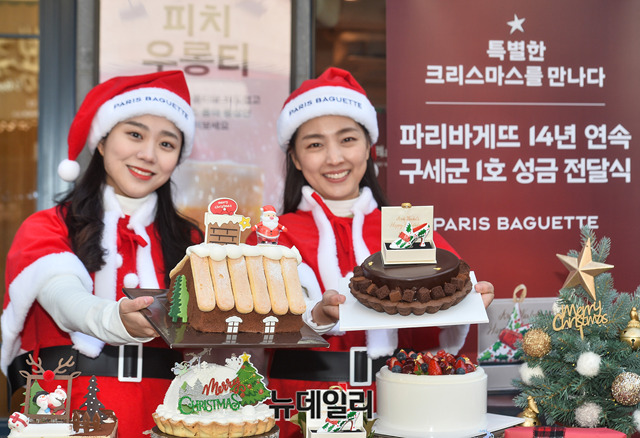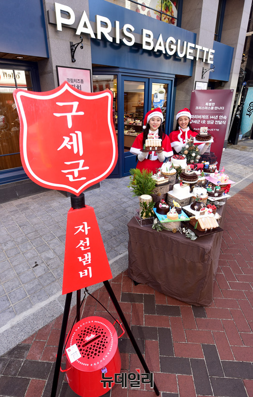 파리바게뜨가 21일 오전 서울 종로구 카페대학로점에서 열린 '구세군 1호 성금 전달식'에서 구세군 자선냄비와 크리스마스 케익을 선보이고 있다.