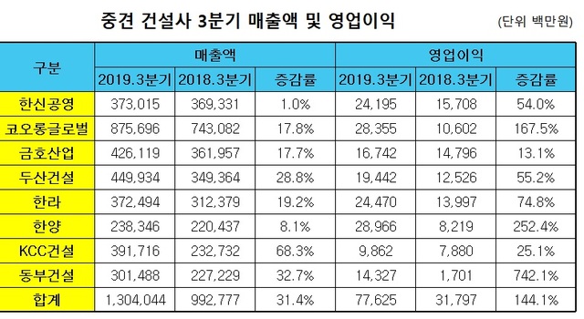 특히 동부건설은 같은 기간 매출은 32.7% 늘어난 3015억원을 기록했지만 영업이익은 7배 이상 증가한 143억원을 거뒀다. 올 들어 수주실적이 9월 말까지 1조3000억원을 넘겼다. 최근 공공과 일반 주택시장 수주 시장에서 성과를 보이며 무서운 실적회복세를 보이고 있다.