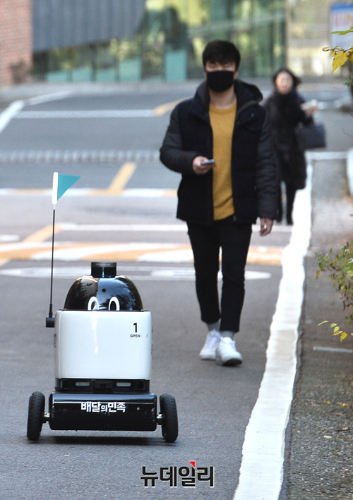 배달의민족 운영사 우아한형제들이 26일 오전 서울 광진구 건국대학교에서 배달 로봇 '딜리' 시범운영을 선보이고 있다.