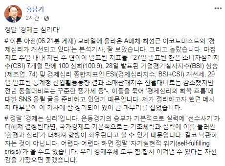 홍남기 경제부총리 겸 기획재정부 장관은 2일 "정말 경제는 심리"라며 "어렵다어렵다 하면 정말 자기실현적 위기(self-fulfilling crisis)'가 올 수 있다"고 말했다.홍 부총리는 이날 자신의 페이스북을 통해 "운동경기 승부가 실력에 '선수사기'가 더해져 결정된다면, 국가경제도 기초체력과 실력에 이를 둘러싼 '환경과 심리'가 더해져 향방이 좌우된다"고 강조했다.12개월 연속 수출이 감소하고 건설업을 중심으로 투자까지 둔화되는 상황에서 올해와 내년 경제성장율마저 불투명하다는 전문가들의 지적에 대한 답변으로 보인다.한국은행이 발표한 11월 경제심리지수(ESI)는 전월대비 0.9%p 상승한 91.5를 기록했다. 여전히 기준치인 100을 하회하고 있지만, 몇개월간 꾸준히 상승했다는 점에서 체감경기가 개선될 것이라는 낙관론도 나오고 있다.통계청 10월 소매판매지수도 전년 동월 대비 2.1% 증가로 나타나면서 증가세를 유지하고 있다. 정부의 확대재정 정책 효과가 나오고 있다는 방증이다.홍 부총리는 "결코 낙관하자는 것이 아니다"라며 "우리 경제주체 모두 힘 합쳐 이겨낼 수 있다는 자신감을 가졌으면 좋겠다"고 했다.