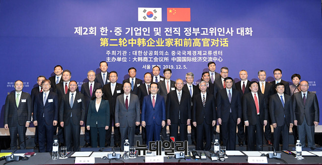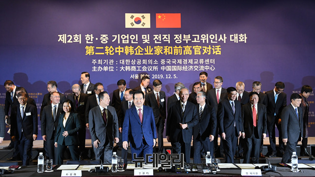 정세균 전 국회의장, 쩡 페이옌 중국 측 위원장, 박용만 대한상의 회장, 정의선 현대자동차 수석부회장, 윤부근 삼성전자 부회장, 김창범 한화케미칼 부회장 및 참석자들이 5일 오전 서울 중구 웨스틴조선호텔에서 열린 '제2회 한·중 기업인 및 전직 정부고위인사 대화'에서 기념촬영을 하고 있다.