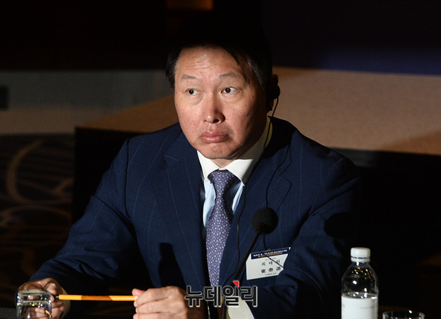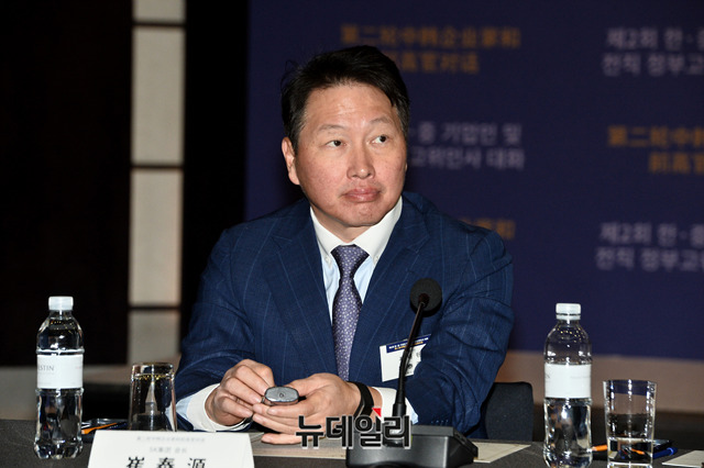 최태원 SK그룹 회장이 5일 오전 서울 중구 웨스틴조선호텔에서 열린 '제2회 한·중 기업인 및 전직 정부고위인사 대화'에서 참석해 자리하고 있다.