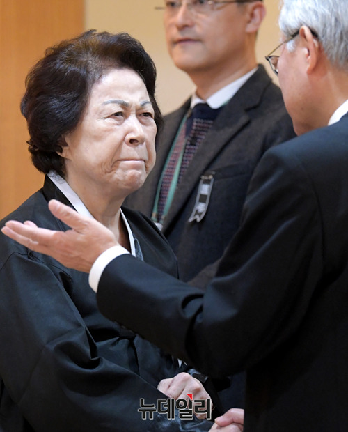故 김우중 전 대우그룹 회장의 부인인 정희자 전 힐튼호텔 회장이 10일 오후 경기 수원시 아주대학교병원 장례식장에 마련된 故 김 전 대우그룹 회장의 빈소를 찾은 조문객들을 맞이하고 있다.