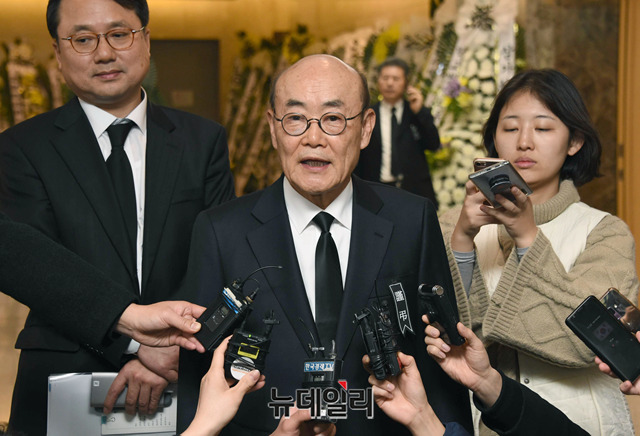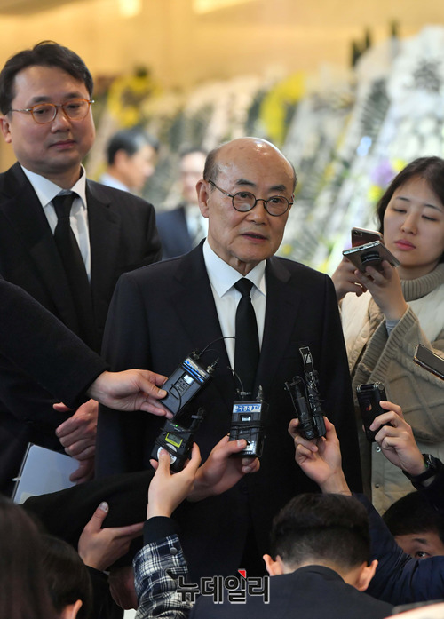 김태구 전 대우자동차 회장이 10일 오후 경기 수원시 아주대학교병원 장례식장에 마련된 故 김우중 전 대우그룹 회장의 빈소를 찾아 조문한 뒤 취재진의 질문에 답하고 있다.