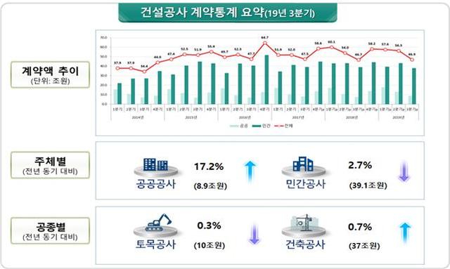 올해 3분기 건설공사 계약액이 지난해에 비해 소폭 증가한 46조9000억원으로 나타났다.