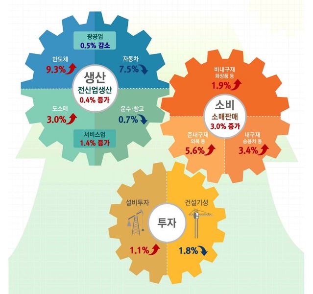 소매판매는 전월대비 3% 오르면서 3개월만에 반등세로 돌아섰다. 코리아세일페스타 등 대규모 프로모션이 영향을 미친 것으로 보인다. 의복 등 준내구재(5.6%), 화장품 등 비내구재(1.9%), 승용차 등 내구재(3.4%) 판매가 모두 늘었다.무점포소매(11.7%), 면세점(40.1%), 승용차 및 연료소매점(4.7%), 편의점(5.8%), 백화점(4.1%), 대형마트(3.8%)의 생산은 증가했다. 하지만 전문소매점(-4.9%), 슈퍼마켓및 잡화점(-3.1%)은 감소해 영세 자영업자는 여전히 어려운 환경으로 분석됐다.설비투자는 컴퓨터사무용기계 등 기계류(-0.3%) 투자는 감소했지만, 항공기 등 운송장비(4.6%) 투자가 늘어 전월 대비 1.1% 증가했다.국내기계수주는 전기업 등 공공 및 전자부품·컴퓨터·영상음향통신 등 민간에서 모두 늘어 전년동월대비 23.6% 올랐다.경기흐름을 나타내는 동행지수순환변동치는 전월 대비 0.1p 하락했다. 두달째 내림세다. 하지만 미래 경기흐름을 나타내는 선행지수 순환변동치는 0.4p 상승해 3개월 연속 오름세를 보였다.김보경 통계청 산업동향과장은 "11월 설비투자가 전년동월과 비교해 12개월 연속 마이너스 흐름을 멈췄다"며 "서비스업 생산이 전산업 생산으로 이어졌고, 코리아세일페스타 영향으로 소비도 크게 증가했다"고 설명했다.