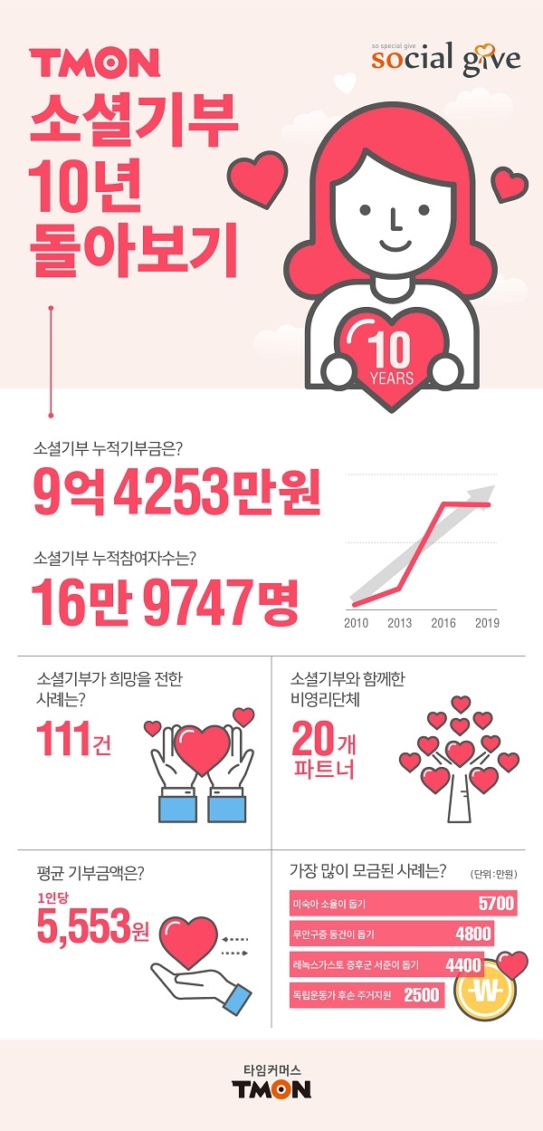 티몬은 올해로 10년차를 맞은 자사 사회공헌 프로그램 '소셜기부'가 올해 6년 연속 기부금 1억원을 넘어서 누적 기부금이 9억4253만원인 것으로 집계됐다고 30일 밝혔다.티몬에서 월 1회씩 진행하고 있는 소셜기부는 티몬의 창립해인 2010년부터 이어져오고 있는 사회공헌 프로그램이다. 국내외 비영리단체들과 손잡고 도움이 필요한 사회 소외계층을 위한 모금을 진행한다. 모금된 기부금은 수수료와 사업운영비를 제하지 않고 100% 전달된다.티몬에 따르면 지난 10년간 총 16만9747명의 고객들이 참여해 만든 누적 기부금 총액은 9억4253만원이다. 1인당 평균 5553원을 기부한 셈이다. 지금까지 밀알복지재단, 기아대책, 한국해비타트 등 20여의 국내외 비영리단체와 협력해왔으며 총 111회의 기부 캠페인을 진행했다.올해 캠페인 수는 12개로 총 1억3600만원이 모금됐다. 1억4100만원을 기록했던 2015년에 이어 두 번째로 큰 성과다. 올해 큰 참여를 이끌어낸 사례는 4월에 진행한 '고성 속초 화재 임시 거주지 지원하기' 긴급 캠페인이었다. 일주일 간 총 2100만원이 모금돼 전달됐다.이진원 티몬 대표는 "소셜기부는 단발적인 모금활동이 아닌, 사업 초창기부터 10년째 지속되고 있는 점에 의미가 있다"며 "갈수록 많은 고객들이 참여하는 만큼 내년에도 도움의 손길이 필요한 곳에 최선을 다해 희망을 전달할 것"이라고 말했다.