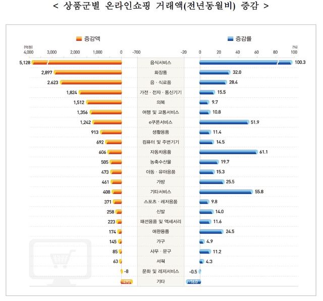 손가락 하나로 가정으로 음식을 받는 온라인쇼핑 매출이 1년만에 2배 넘게 증가했다.음식점의 배달서비스과 활성화되고, 가정간편식을 판매하는 온라인쇼핑몰이 호황을 누리는 등 소비행태 변화에 따른 것으로 보인다.통계청이 2일 발표한 자료에 따르면 지난해 11월 온라인쇼핑 총 거래액은 12조 7천576억원으로 전년 같은달 대비 20.2%가 증가했다. 이는 전체 소매판매액 41조 9천587억원의 23.1%에 달하는 수치다.뚜렷이 성장한 온라인쇼핑 상품군을 보면 음식서비스가 100.3% 증가했고, 화장품(32%), 음식료품(28.4%), 가전·전자·통신기기(15.5%) 순이었다.통계청은 중국 등 외국인 관광객이 증가하면서 온라인 면세점 거래가 증가한 것과, 코리아세일페스타 등 대규모 프로모션으로 대형가전의 온라인 거래가 늘어난 것으로 분석했다.