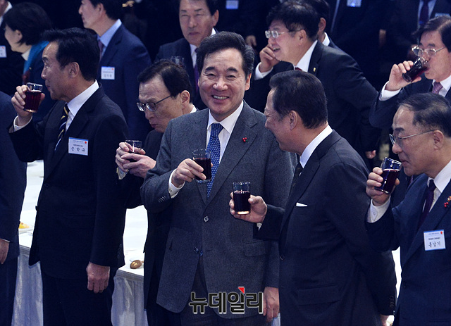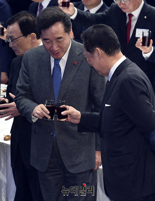 이낙연 국무총리가 3일 오후 서울 강남구 코엑스에서 열린 '2020년 경제계 신년인사회'에서 박용만 대한상공회의소 회장과 건배를 하고 있다.