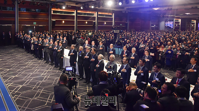 이낙연 국무총리, 박용만 대한상공회의소 회장, 이해찬 더불어민주당 대표, 손학규 바른미래당 대표 등 참석자들이 3일 오후 서울 강남구 코엑스에서 열린 '2020년 경제계 신년인사회'에서 국민의례를 하고 있다.