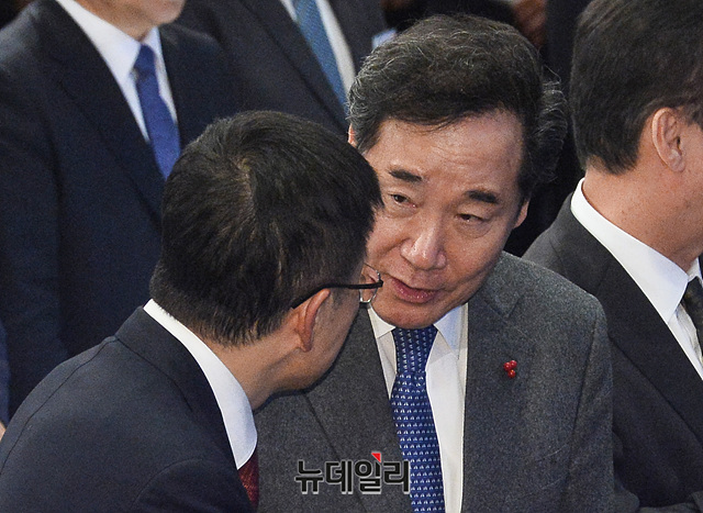 이낙연 국무총리와 황교안 자유한국당 대표가 3일 오후 서울 강남구 코엑스에서 열린 '2020년 경제계 신년인사회'에서 대화를 나누고 있다.