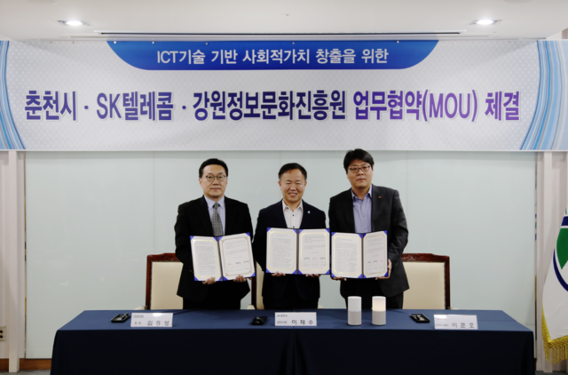 SK텔레콤이 춘천시, 강원정보문화진흥원과 손잡고 춘천시의 사회적 문제 해결 및 ICT 인프라 환경 조성에 나선다.SK텔레콤은 춘천시청에서 'ICT 기술 기반 사회적 가치 창출을 위한 업무협약'을 체결했다고 16일 밝혔다. 체결식에는 이준호 SK텔레콤 SV추진그룹장, 이재수 춘천시장, 김흥성 강원정보문화진흥원장 등이 참석했다.이번 협약을 시작으로 SK텔레콤은 춘천시가 겪고 있는 사회 문제 해결을 위한 프로젝트를 본격 추진한다. SK텔레콤은 인공지능 돌봄 서비스로 홀몸 어르신을 케어하고 행복코딩스쿨을 통해 특수학교 학생 교육을 실시하는 등 춘천시 사회 문제 해결에 힘을 보탤 계획이다.우선 내달부터 SK텔레콤은 춘천시에 거주하는 65세 이상 홀몸 어르신 200명을 대상으로 음성인식 AI 스피커 '누구'를 활용한 '인공지능 돌봄 서비스'를 확대 실시한다.'인공지능 돌봄 서비스'는 SK텔레콤이 지난해 4월 지방자치단체, 사회적 기업 '행복한 에코폰'과 협력해 여러 지자체의 홀몸 어르신을 대상으로 시작한 ICT 연계 복지 서비스다. 감성 대화, 음원 스트리밍 서비스 및 날씨, 건강 상식 등 유용한 정보도 제공한다. 위급 상황에서 음성만으로도 119를 호출할 수도 있다.SK텔레콤은 춘천시의 장애 특수 학교인 계성학교와 명진학교 학생들을 대상으로 소프트웨어 교육 '행복 코딩스쿨' 교육도 이어 나갈 계획이다. 행복 코딩스쿨은 스마트 로봇 '알버트'를 활용해 장애 유형과 학습 능력에 따라 맞춤화 된 교육 커리큘럼으로 수학 기본 개념과 '코딩'을 보다 쉽고 재미있게 접근할 수 있도록 하는 프로그램이다.이와 함께 SK텔레콤은 춘천 서면 애니메이션박물관 일대에 VR 영화관, AR동물원 등을 구축, 5GX 서비스 복합 체험 공간을 조성한다.SK텔레콤은 지난 4일부터 춘천시 서면 2200평의 애니메이션 박물관 광장에 'AR동물원'을 운영하며 춘천 시민들에게 색다른 즐거움을 선사하고 있다. 2월부터는 애니메이션 박물관에 SK텔레콤의 미디어 플랫폼 'Jump VR'앱을 이용해 다양한 VR 콘텐츠를 경험해볼 수 있는 100석 규모의 'VR 영화관'도 구축할 계획이다.