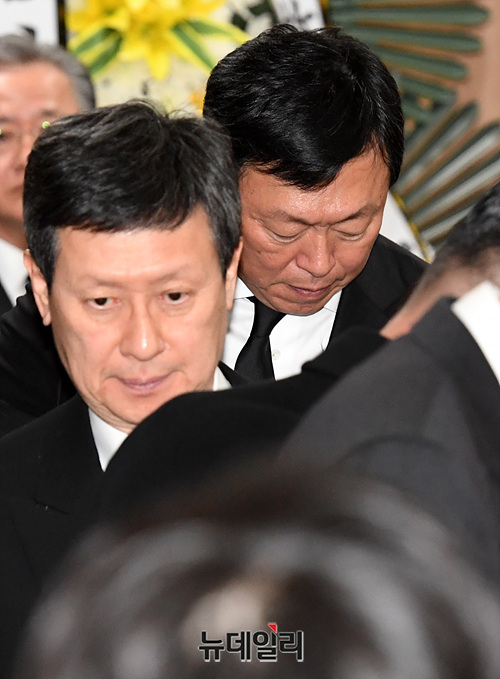 신동빈 롯데그룹 회장과 신동주 전 롯데홀딩스 부회장이 20일 오후 서울 송파구 서울아산병원 장례식장에 마련된 故 신격호 롯데그룹 명예회장의 빈소에서 입관식을 위해 이동하고 있다.
