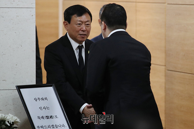 신동빈 롯데그룹 회장과 구광모 LG회장이 21일 오후 서울 송파구 서울아산병원 장례식장 마련된 故 신격호 롯데그룹 명예회장 빈소에서 인사를 나누고 있다.