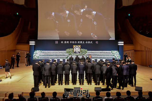 신동빈 롯데그룹 회장과 신동주 전 롯데홀딩스 부회장, 롯데 임직원 등 관계자들이 22일 오전 서울 송파구 롯데월드몰 롯데콘서트홀에서 열린 故 신격호 롯데그룹 명예회장의 영결식에서 고인에게 묵념을 하고 있다.