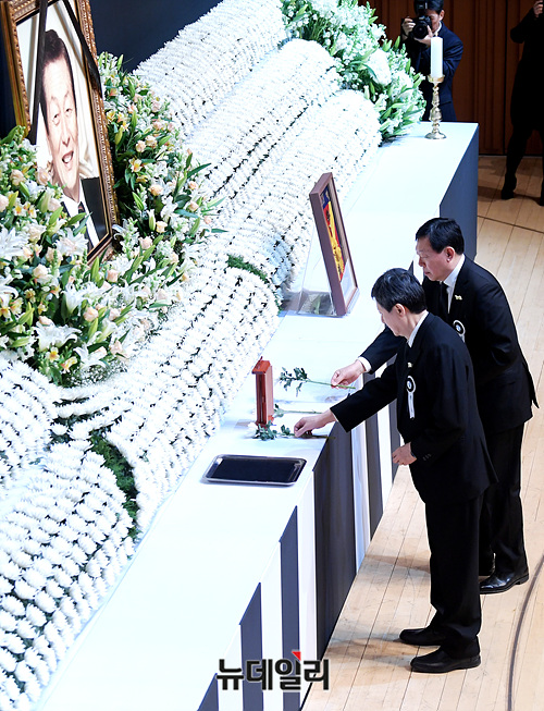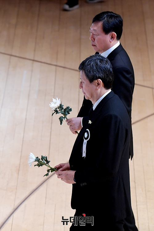 신동빈 롯데그룹 회장과 신동주 전 롯데홀딩스 부회장이 22일 오전 서울 송파구 롯데월드몰 롯데콘서트홀에서 열린 故 신격호 롯데그룹 명예회장 영결식에서 헌화하고 있다.