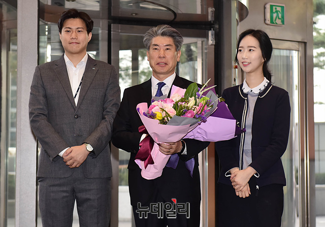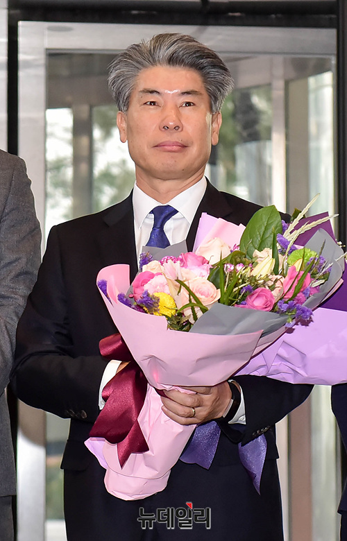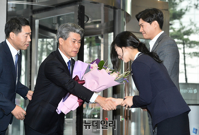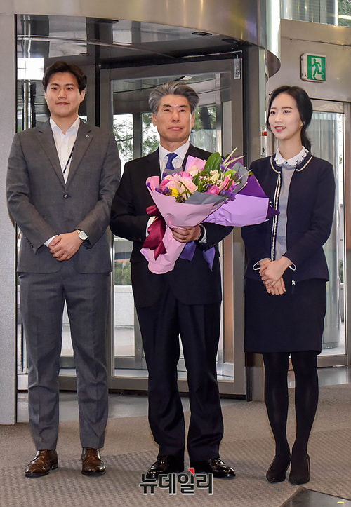 윤종원 신임 IBK기업은행장이 29일 오전 서울 중구 기업은행 본점에서 열린 취임식을 위해 출근하며 직원들에게 축하 꽃다발을 받고 기념촬영을 하고 있다.