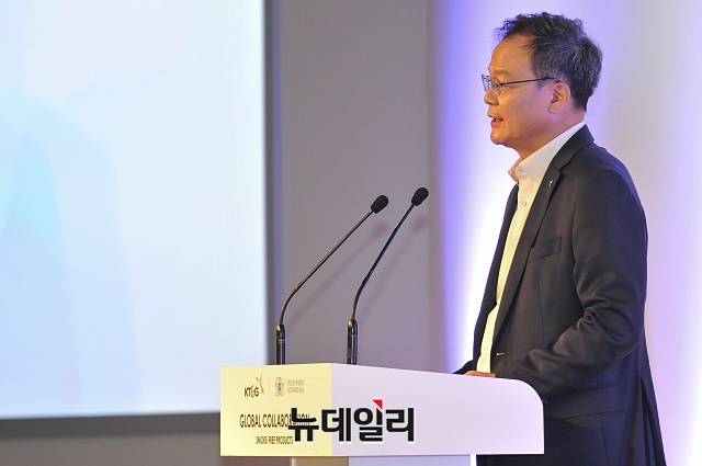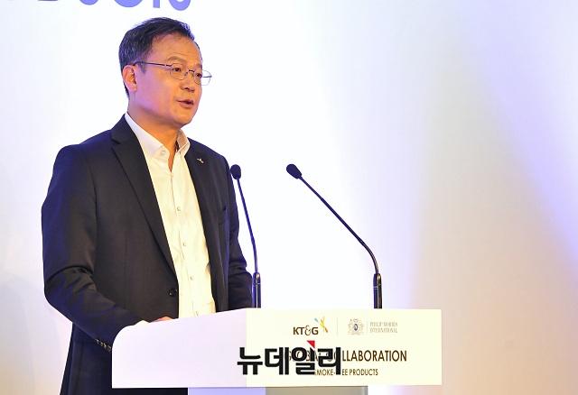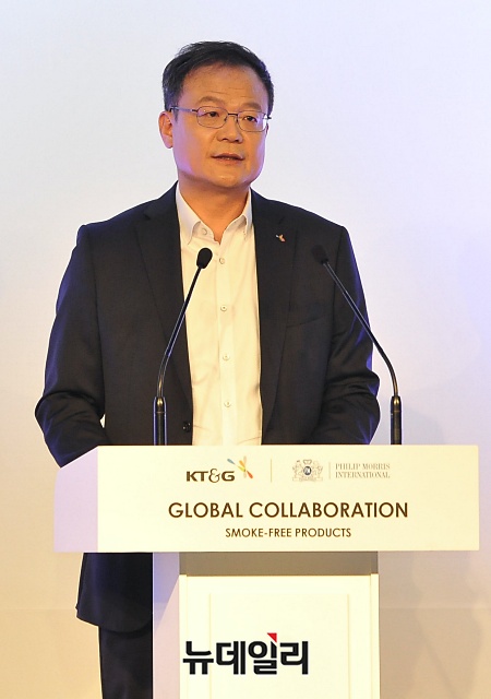 백복인 KT&G사장이 29일 오전 서울 광화문 포시즌스 호텔에서 열린 'KT&G 전자담배 릴 글로벌 수출 계약 발표 기자간담회'에서 인사말을 하고 있다.