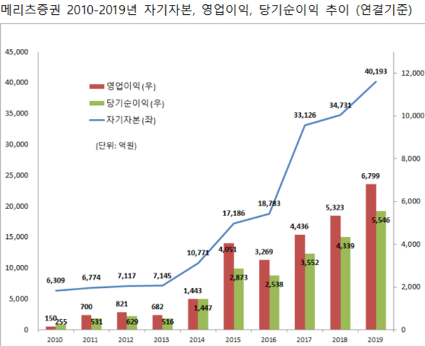 메리츠증권은 앞서 지난 2018년 4338억원의 순이익을 기록, 창사 이래 최고치를 달성한 데 이어 1년 만에 또 다시 최대 실적을 기록했다. 영업이익은 6799억원으로 전년보다 27.7% 늘었다.