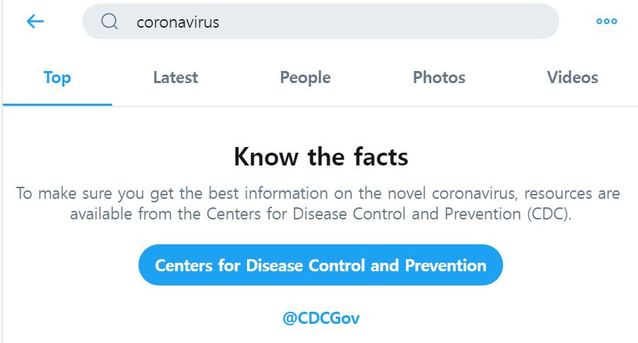 트위터가 중국발 신종 코로나바이러스 감염증인 ‘우한 폐렴’과 관련성이 높은 키워드를 검색할 경우 질병관리본부로 자동 안내하는 안내 메시지 기능 #KnowTheFacts 를 한시적으로 제공한다고 30일 밝혔다.트위터의 신종 코로나바이러스 감염증 관련 안내 메세지는 한국을 포함해 일본, 홍콩, 대만, 싱가포르, 태국, 필리핀, 말레이시아, 베트남, 호주, 뉴질랜드, 미국, 캐나다, 브라질 등 총 14개 국가에서 제공된다. 해당 국가 트위터 이용자는 관련 키워드 검색 시 각 국가별 질병 관련 파트너 기관으로 연계하는 안내 메시지를 받게 된다.#KnowTheFacts 기능이 적용되는 키워드에는 ‘코로나’, ‘중국폐렴’, ‘확진자' 등 직접적인 키워드가 우선 선정됐다. 국내 검색 키워드 리스트는 질병관리본부 위기소통담당관실과 협력을 통해 구성됐다. 글로벌 검색 키워드 리스트는 미국 질병통제예방센터, 일본 후생노동성, 태국 공공보건부, 싱가포르 보건부, 홍콩 보건국 등 해당 국가의 보건당국과 긴밀한 공조를 통해 준비됐다.