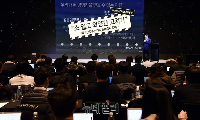 강성부 KCGI 대표가 20일 오후 서울 여의도 글래드호텔에서 열린 한진그룹 정상화를 위한 주주연합 기자간담회에서 '한진그룹의 위기진단과 미래방향, 전문경영인의 역할' 관련 발언을 하고 있다.
