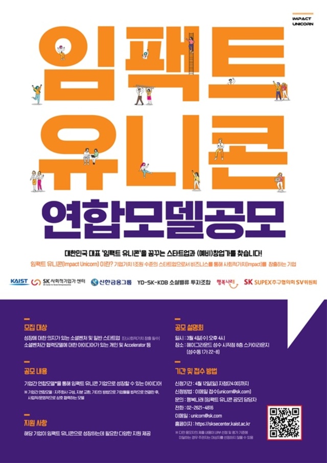 각종 사회문제 해결에 기여하는 소셜벤처를 대기업과 금융기관, 대학이 손을 잡고 집중 육성에 나선다.SK와 신한금융그룹, 카이스트(KAIST) SK사회적기업가센터, 옐로우독(YD)-SK-KDB 소셜밸류 투자조합은 4월 12일까지 소셜벤처 및 예비 창업가를 대상으로 ‘임팩트 유니콘’ 연합 모델을 공모한다고 21일 밝혔다.‘유니콘’은 통상 기업가치 1조원 수준의 스타트업을 일컫는다. 사회적 가치를 함께 창출함으로써 사회 문제 해결에 기여하는 유니콘 기업이 ‘임팩트 유니콘’이다.이번 공모의 특징은 ‘기업간 연합 모델’로 대상을 한정한다는 점이다.즉, 복수의 소셜벤처가 지분 교환 혹은 별도의 지주회사 설립을 통해 연대한 뒤 향후 성장 계획을 제시하면 이를 심사해 전폭적으로 지원하는 방식이다.상품 공동개발 등 단순 협업 수준을 넘어 소셜벤처 간 긴밀한 결합을 통해 지원효과를 극대화하겠다는 의미다. 개별 소셜벤처가 유니콘급 기업으로 성장하기까지 난관이 적지 않다는 현실을 감안한 방식이다.이와 관련, 최태원 SK회장은 사회적 기업에 우수한 인재들이 몰리게 하려면 일정 수준 이상의 매출과 세계적 수준의 잠재력을 갖춰야 하며, 소셜벤처 간 연대와 결합을 통해 성장 속도를 높이는 게 더 효율적일 수 있다고 강조해 왔다.공모 신청방법 및 제출서류 등 세부사항은 카이스트 SK사회적기업가센터 홈페이지에서 확인할 수 있다. 다음달 4일에는 서울 성수동 헤이그라운드에서 설명회가 열린다.공모에서 선정되면 기업 성장에 필요한 마케팅, 재무, IT(정보기술) 서비스는 물론 사업 추진을 위한 인적 자원 및 외부 투자자 연계 등을 지원받게 된다.공모 주관사 중 신한금융그룹은 혁신기업 발굴 육성 플랫폼인 '신한퓨처스랩'을 통해 '임팩트 유니콘' 육성의 취지에 부합하는 '기업간 연합 모델' 발굴과 사업화 지원에 참여한다.신한금융희망재단과 신한대체투자운용은 참여기업에 대한 임팩트 투자를 추진함으로써, 참여기업들이 임팩트 유니콘으로 빠르게 성장할 수 있는 다양한 지원을 계획 중이다.공모를 주관하는 SK수펙스추구협의회 이형희 SV위원장은 "유망한 소셜벤처들이 연대와 협업을 통해 안정적이면서도 빠른 성장을 하도록 지원하고자 한다”며 ”한국에서도 세계적인 임팩트 유니콘이 탄생할 수 있도록 지원을 아끼지 않을 것”이라고 말했다.