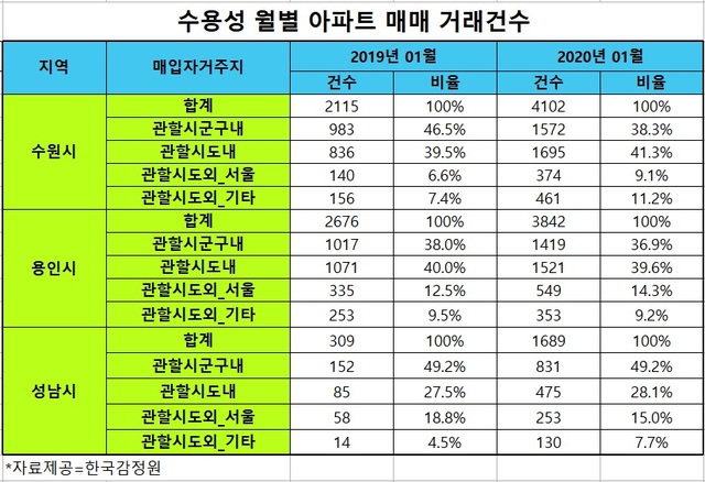 용인시에서도 지난 1월 902건(서울 549건, 기타 353건)이 외지인 거래로, 지난해 1월(588건)보다 약 1.5배 늘어났다. 성남시에선 같은 기간 72건에서 383건으로 5.3배나 증가했다.