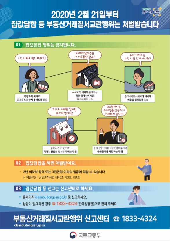 온라인 커뮤니티(카페 등)를 통한 가격담합 등 부동산 거래질서 교란행위에 대해 누구나 신고 가능하다. 국민들의 원활한 신고센터 이용을 위해 교란행위 유형 및 신고‧접수 절차 등에 대한 상담 콜센터와 전용홈페이지(cleanbudongsan.go.kr)도 운영한다.