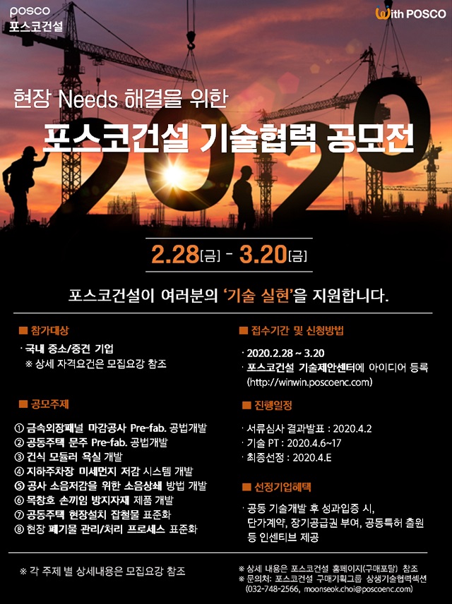 포스코건설이 현장 노하우가 많은 중소기업과 '현장 니즈(Needs) 해결을 위한 기술협력 공모전'을 개최한다고 10일 밝혔다.