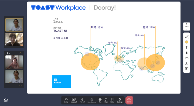 NHN은 클라우드 협업 플랫폼 '토스트 워크플레이스 두레이'의 신규 가입자 수가 급격히 증가한 것으로 나타났다.13일 회사 측에 따르면 지난달 27일 토스트 워크플레이스 두레이의 무상지원 결정 이후, 일평균 신규 가입자 수는 '코로나19' 확산 전보다 약 4배 증가했다.특히 토스트 워크플레이스 두레이에 탑재된 화상 회의 기능은 국내 주요 기업의 재택근무가 결정된 지난달 26일부터 상승 곡선을 그리면서, 3월 첫 주에는 전월 동기 대비 약 25배 증가한 사용량을 나타냈다.업무 관리 및 협업툴 서비스인 프로젝트, 메신저, 메일 기능의 접속 트래픽은 일평균 약 30%가 증가했다.토스트 워크플레이스 두레이의 화상 회의 서비스는 최대 14명의 다자간 화상 채팅 뿐 아니라 회의 내용을 기록할 수 있는 노트 및 녹화, 파일 공유 기능 등을 제공한다.한편 NHN은 '코로나19' 사태 종료까지 신규 가입 및 적용하는 모든 중소기업에 서비스 인원 수 제한없이 토스트 워크플레이스 두레이를 3개월 간 무료 제공한다.