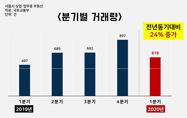 14일 빌딩중개전문업체 빌사남에 따르면 올 1분기(1~3월) 서울지역 상업용부동산 매매거래량은 총 618건으로 전년동기 497건과 비교해 24%나 증가했다.