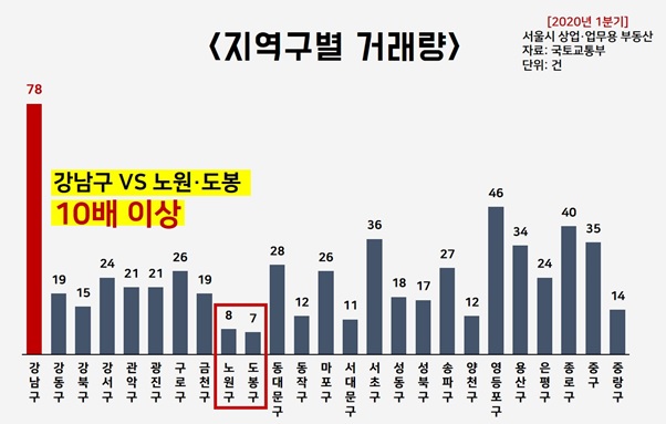 1분기 서울 상업용부동산 전체거래액은 3조9711억원으로 이중 강남구 거래액이 전체의 23%인 8971억3927만원으로 비중이 가장 컸다.
